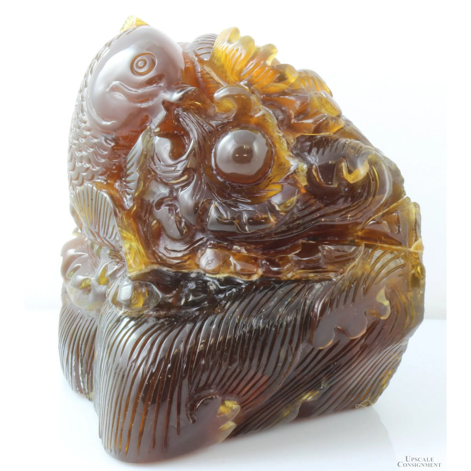 Hand-Carved Burmese Myanmar Amber KOI Sculpture & Pedestal