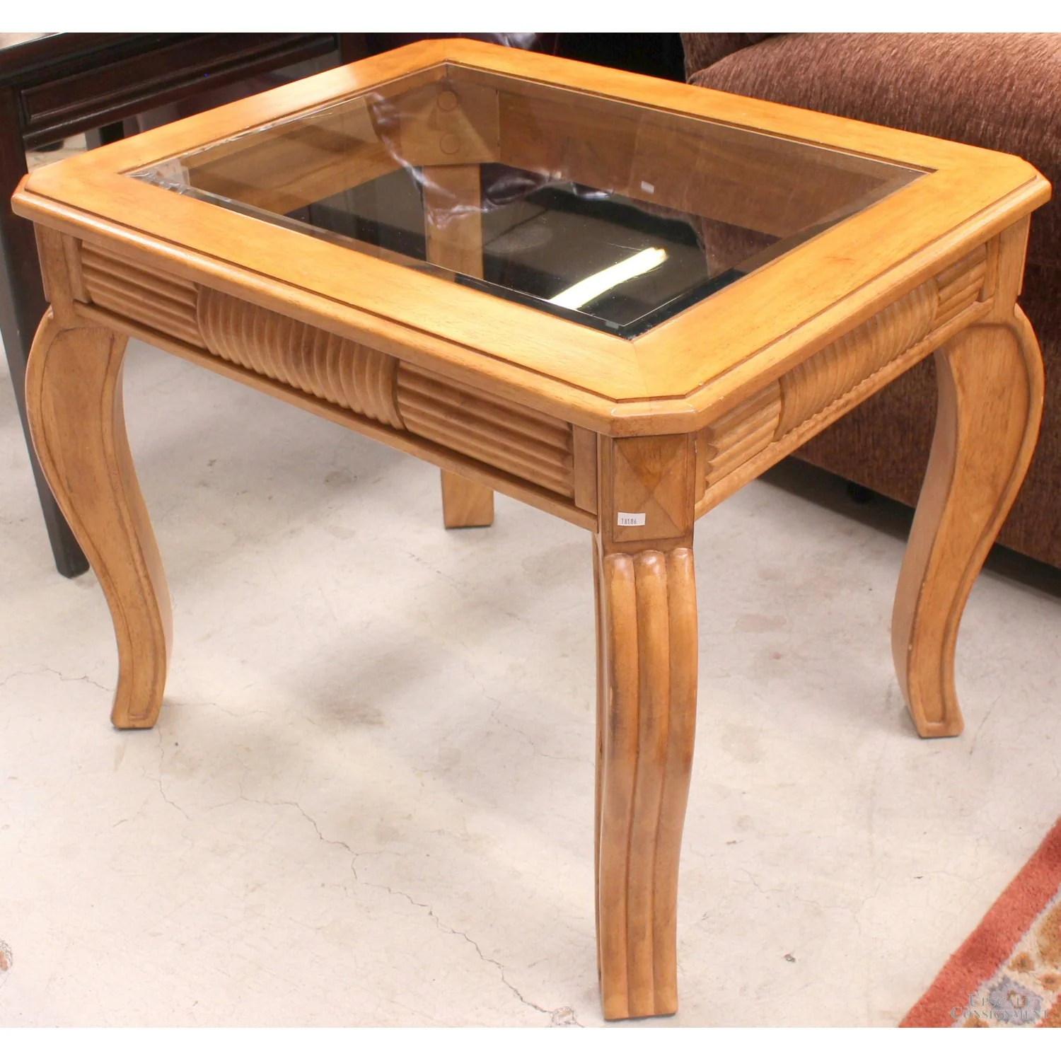 Clearance Priced! Features a warm mahogany finish, rectangular table top with a beveled glass insert, carved wood skirted trim, and 4 curved legs.