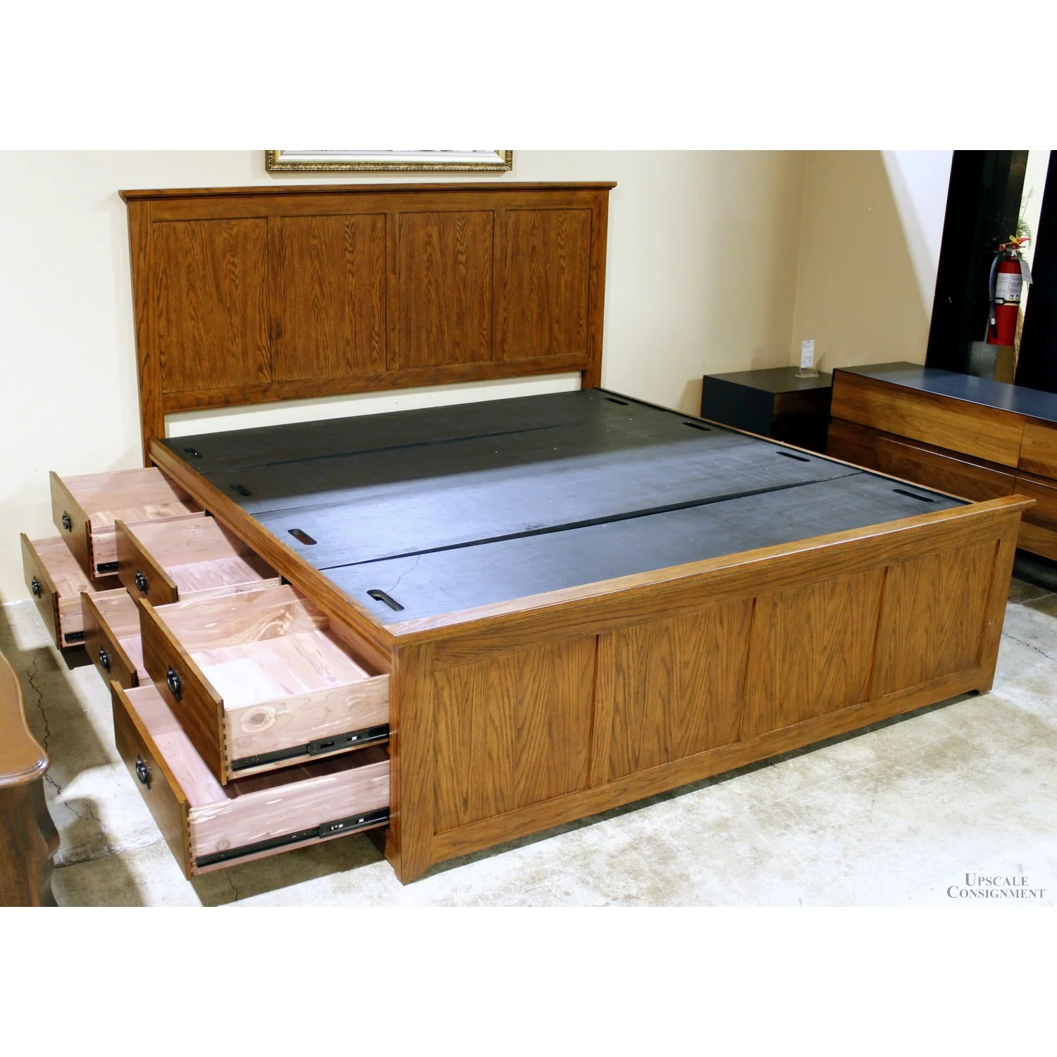 This piece features a paneled headboard and footboard in a warm medium‑brown finish with visible grain. The base incorporates twelve integrated storage drawers, arranged along the sides for concealed organization. Black platform-style supports span the interior, providing a stable surface for the mattress. Brand New, Online Order Cancellation Item!