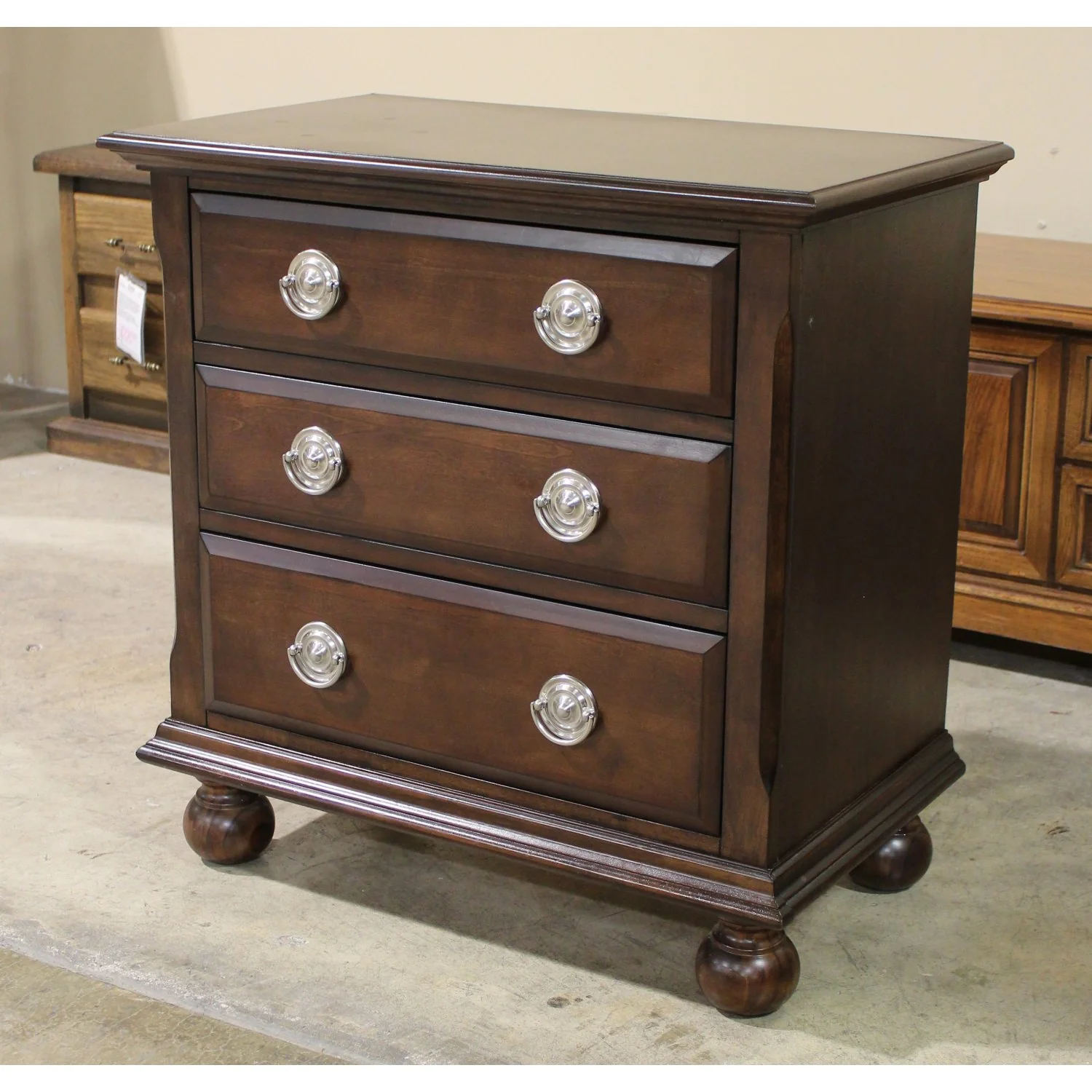 Classic three-drawer nightstand in rich mahogany finish, featuring silver-tone round pulls and decorative molding along the top and base. Each drawer offers full-width storage and smooth operation. The piece stands on four bun feet for added stability and traditional appeal. Suitable for bedroom or accent use.